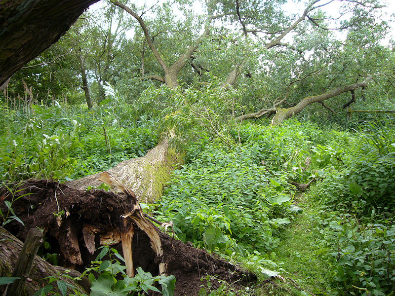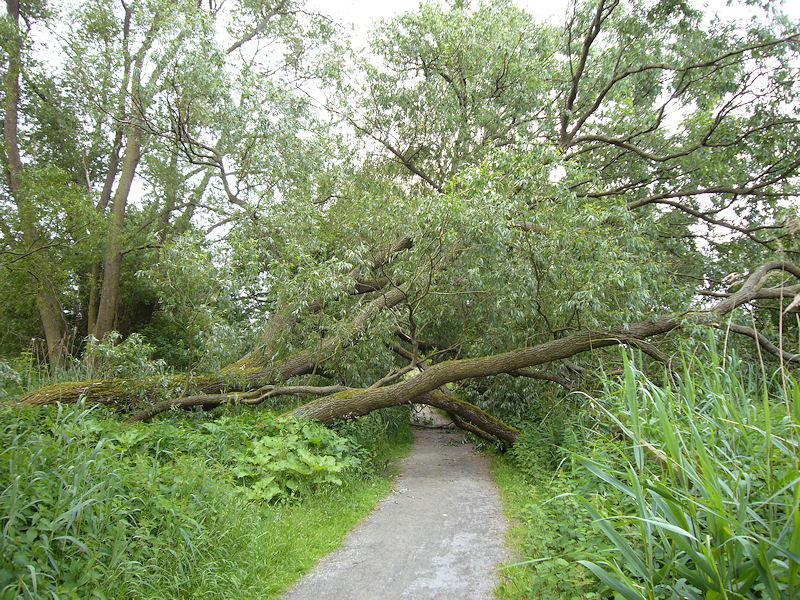 22. Juni 2010: Astbruch: Am Wochenende ist ein großer Ast dieser alten Korbweide an der Ottenroder Straße kurz vor der Schunterbrücke schließlich umgestürzt, nachdem er sich in den letzten Monaten bereits verdächtig geneigt hatte. Zum Glück war wohl niemand darunter. Der Zaun der angrenzenden Wiese wurde allerdings zerstört. Am Montag morgen war der Weg bereits wieder freigesägt. (Ins Bild klicken zum Starten der Fotoserie)
