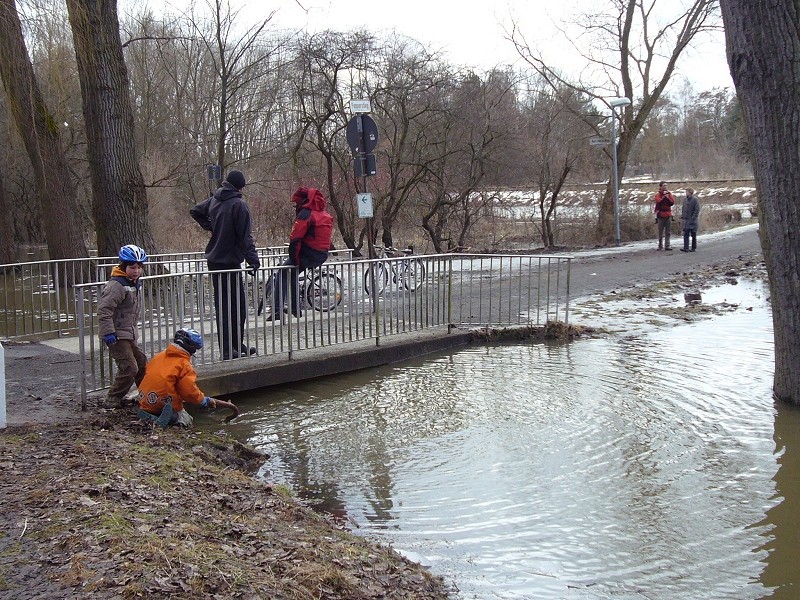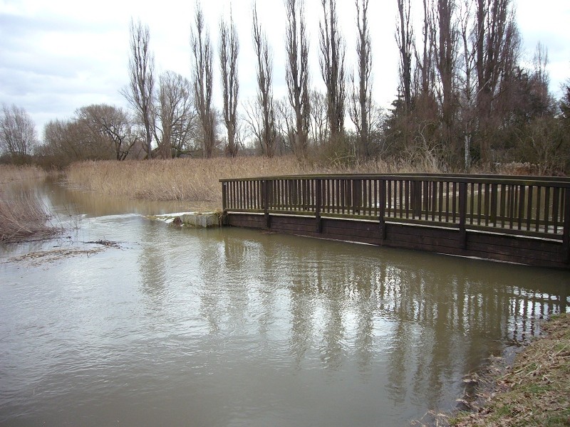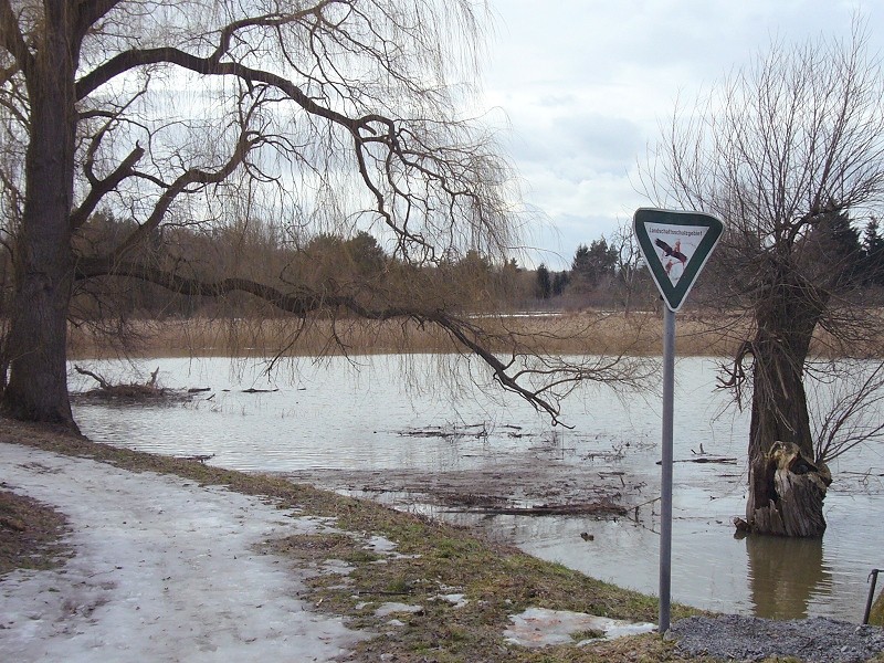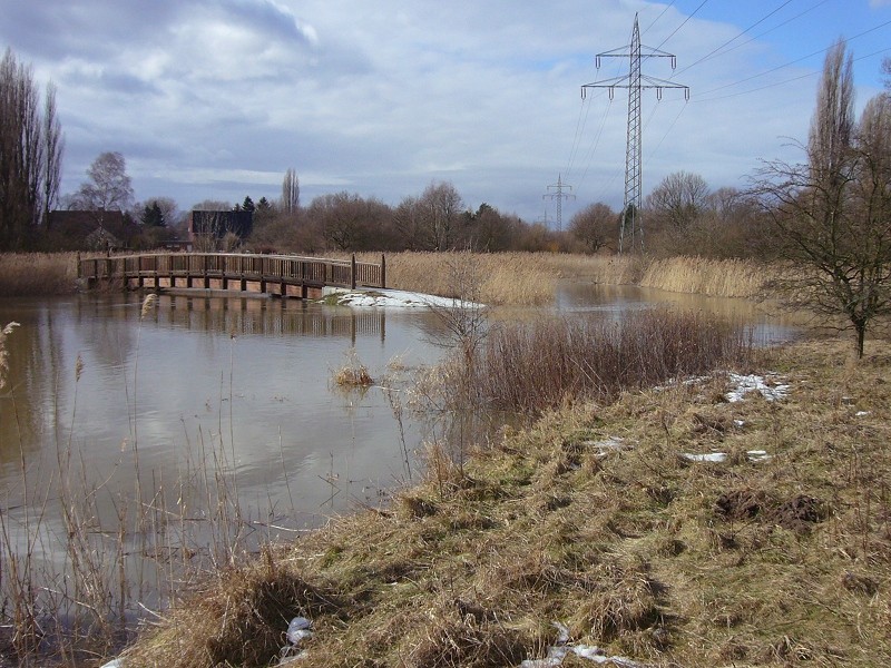 28. Februar 2010: Vom Eise befreit sind Straßen und Wege. Sieh nur, sieh! Wie der Fluss in Breit und Länge über die Ufer tritt (frei nach Goethe). Durch die Schneeschmelze sind Wabe, Mittelriede und Schunter angestiegen. Die Pegel der Schunter haben die Meldestufe drei (Gefahr größerer Überschwemmungen) überschritten, sind aber zur Zeit leicht rückläufig (siehe → Pegel Glentorf und → Pegel Harxbüttel). Die Überschwemmungen haben die Verbindungswege und Fußgängerbrücken unpassierbar gemacht (für Fotostrecke auf das Bild links klicken). Entsprechend ihrer Funktion als Entlastungsgraben für die Wabe führt die Mittelriede dabei sehr viel mehr Wasser als die Wabe (siehe Abschnitt Gewässer). Zusätzlich wird nun auch noch das Sturmtief Xyntia erwartet, das reichlich Regen bringen kann (→ Unwetterzentrale). Damit besteht die Möglichkeit, dass die Flüsse ihre gerade vom Land ausgewiesenen Überschwemmungsgebiete (s. u.) "austesten" werden. (Ins Bild Klicken für Fotoserie)