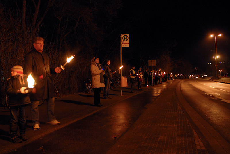 Sonntag, 11. März 2012, 18.30 bis 19.20 Uhr. Anlässlich des ersten Jahrestags der Katastrophe im japanischen Atomkraftwerk Fukushima sind alle Bürger der Region Braunschweig aufgefordert, sich an der Lichterkette zu beteiligen. Der Rat der Stadt Braunschweig ruft zur Teilnahme auf. Eine entsprechende Resolution hat der Rat in seiner Sitzung am 28. Februar beschlossen. Die Lichterkette formiert sich zwischen 19.00 und 19.20 Uhr vom Braunschweiger Stadtteil Thune bis zum Schacht Asse II im Landkreis Wolfenbüttel und bis zum Schacht Konrad in Salzgitter. Aus der Flugzeugperspektive soll ein großes, leuchtendes "A" entstehen, das 79 Kilometer lang sein wird. Die Strecke der Lichterkette verläuft durch die Schuntersiedlung! Am Tostmannplatz wird sich ein Infopunkt befinden, der von AK Grundschule Schuntersiedlung, Bürgerforum Schunteraue, BIBS, Stadtbezirksratsfraktion der Grünen in der Schunteraue, BI Kralenriede gegen die Landebahnverlängerung und SPD Schunteraue betreut wird. Es wird Heißgetränke geben. Informationen über den gesamten Streckenverlauf und eine interaktive Karte finden sich im Internet unter → www.lichterkette2012.de.