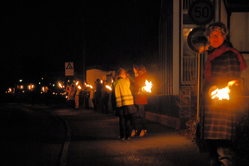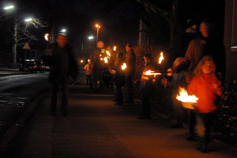 Sonntag, 11. März 2012: Die aus 24 000 Menschen gebildete Lichterkette zwischen Thune, Asse und Schacht Konrad verläuft durch die Schuntersiedlung. Zahlreiche Schuntersiedler, darunter viele Familien, haben sich mit Fackeln versorgt, bilden einen Teil der 80 Kilometer langen Menschenkette und gedenken der Katastrophe in Fukushima vor genau einem Jahr. Dicht an dich stehen die Menschen: Die Kette erstreckt sich vom Bienroder Weg aus Kralenriede kommend, am Tostmannplatz vorbei entlang der Mergesstraße zum Ohefeld. Dort brennt ein riesiges A als Ermahnung, auf das Atommülllager Asse aufzupassen, und zukünftig sorgsamer mit Atommüll umzugehen. Die Braunschweiger Zeitung ist vor Ort und fotografiert die Szene. Die Menschen sind trotz des bedrückenden Themas guter Dinge, halten zusammen und freuen sich, dass so viele Menschen ihre Meinung deutlich zeigen. Die Fackeln verbreiten eine beeindruckende Stimmung. Um 19.20 Uhr ist löst sich die Menschenkette auf und die Teilnehmenden gehen diskutierend nach Hause. Fotogalerie
