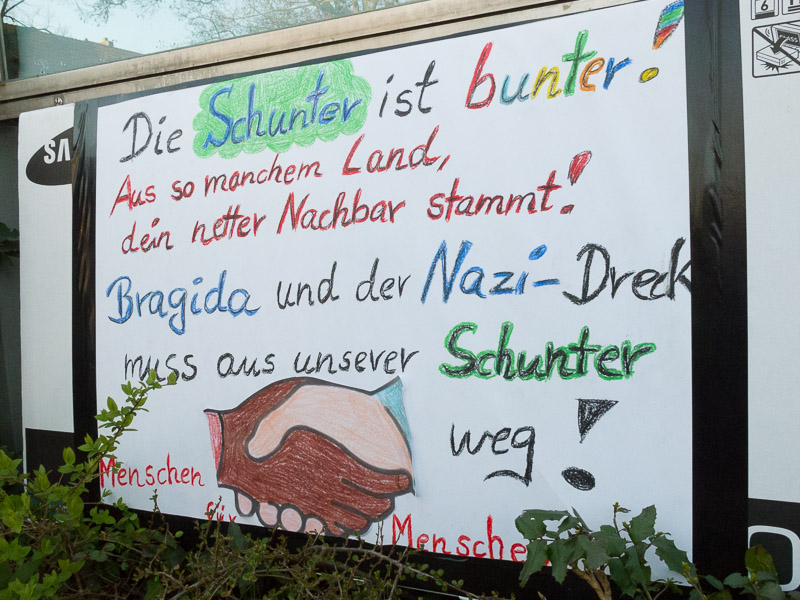 Freitag, 27. März 2015: Die Stadt Braunschweig hat Bragida für kommenden Montag, 30.3.2015, eine Demonstration auf dem Tostmannplatz in der Schuntersiedlung genehmigt. Die ausländerfeindliche Bragida verfolgt offensichtlich das Ziel, ihre Demonstrationen nahe an die Aufnahmeeinrichtung für Asylsuchende in Kralenriede zu platzieren, um die teilweise in Kralenriede bereits vorhandene Stimmung gegen die Flüchtlinge wieder anzuheizen. Das → Braunschweiger Bündnis gegen Rechts wird um 18:00 Uhr ebenfalls am Tostmannplatz eine Gegenkundgebung abhalten und ruft alle BuergerInnen auf, lautstark gegen die Flüchtlingshetze zu demonstrieren und für Toleranz und Hilfsbereitschaft einzustehen; Näheres zur Gegendemo siehe Termin oben. Lesen Sie dazu auch den Kommentar des Schuntersiedlers Alexander Wallasch im Debattenmagazin → The European. Der Tostmannplatz wird am Montag weiträumig für den Verkehr gesperrt werden. Die Buslinien 416 und 436 müssen in beiden Richtungen ab zirka 14:00 Uhr umgeleitet werden. Näheres siehe → Pressemitteilung der Stadt und der → Verkehrs-GmbH.