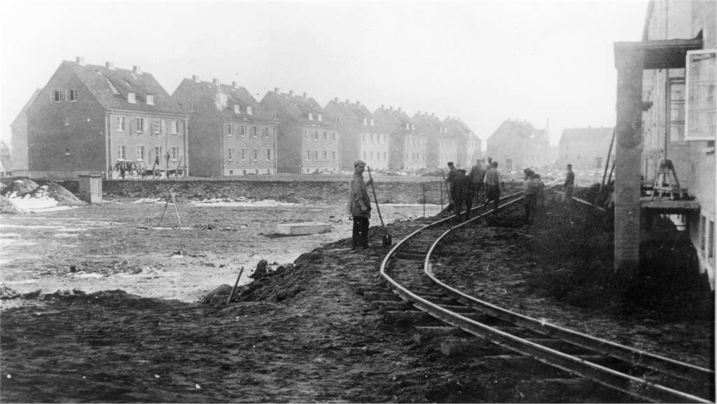 Bau des westlichen Teils. Im Vordergrund die Bahnlinie, Kreuzung Bienroder Weg. | Bau mit der Strecke der Lorenbahn. Zoom |