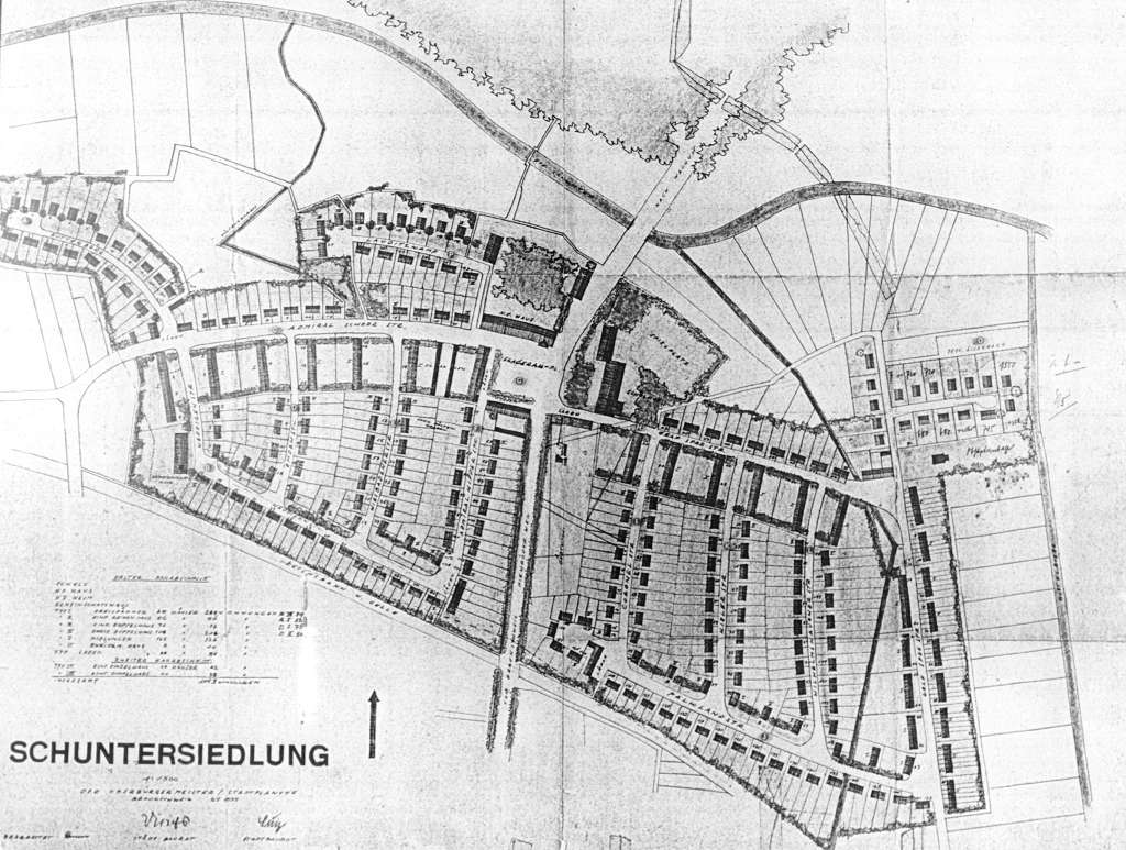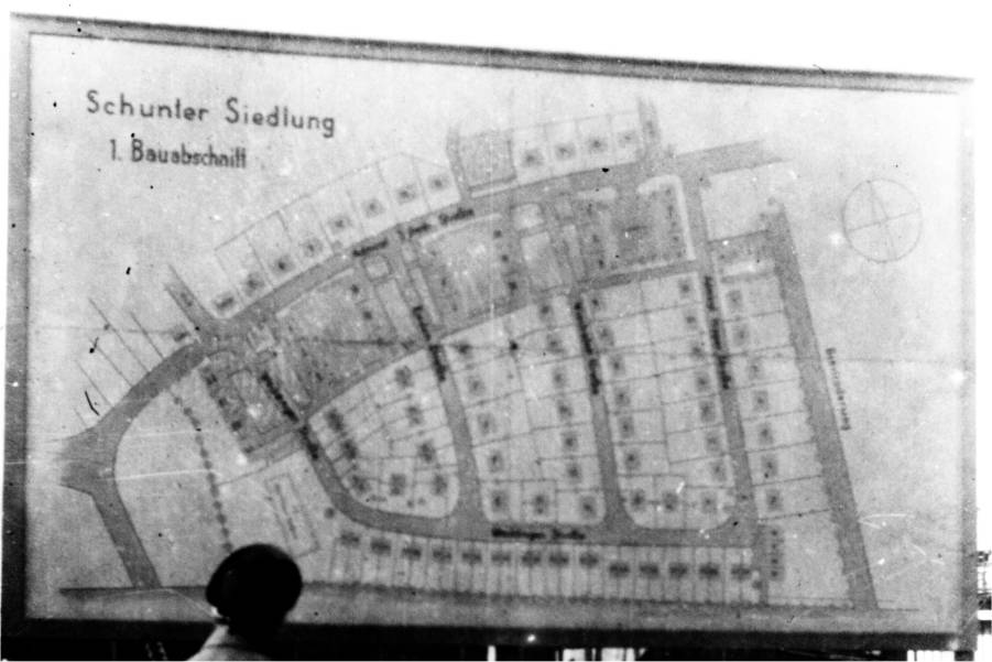 Bauschild des ersten, westlichen Bauabschnitts. Zoom | Plan der Schuntersiedlung von 1937. Interaktive Erläuterungen: Fahren Sie dazu mit dem Mauszeiger über den Plan. Schon 1937 geplant, aber erst später realisiert sind die Bebauungen am Butterberg und an der Steinhorstwiese. Der Syltweg ist schon als Gartenweg erkennbar. Rot: die ursprünglich um den Skagerakplatz (später Tostmannplatz) geplanten Einrichtungen: NS-Haus, HJ-Heim, Schule, Spielplatz, Läden sowie ein Gemeinschaftshaus (westlich). Blau: Neben Schunter und Mittelriede sind noch die alten Verläufe des Bültengrabens zu erkennen. Außerdem sichtbar: die Bebauung am Lauditzkamp sowie die alte Schunterbrücke. Zoom |