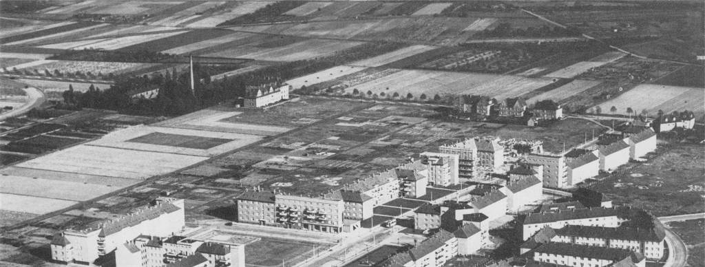 Luftaufnahme des Siegfriedviertels in nordöstlicher Richtung, ca. 1930. Mittig verlaufend der Bienroder Weg als Allee. Das Wasserwerk ist am Schornstein zu erkennen. Links daneben die ringförmige Straßenbauversuchsstrecke. Oben links sind auf dem Gebiet des heutigen Syltwegs einige Kleingärten zu erkennen. Im Bogen erstreckt sich die Bahnlinie. Rechts oben schräg verlaufend die Ottenroder Straße. Zoom |