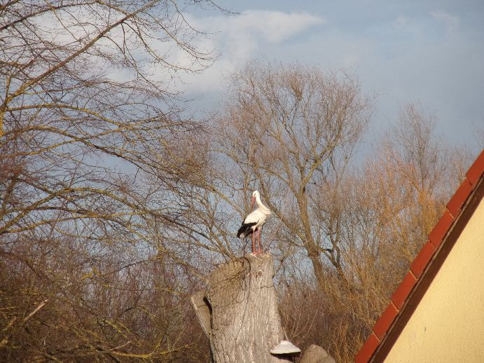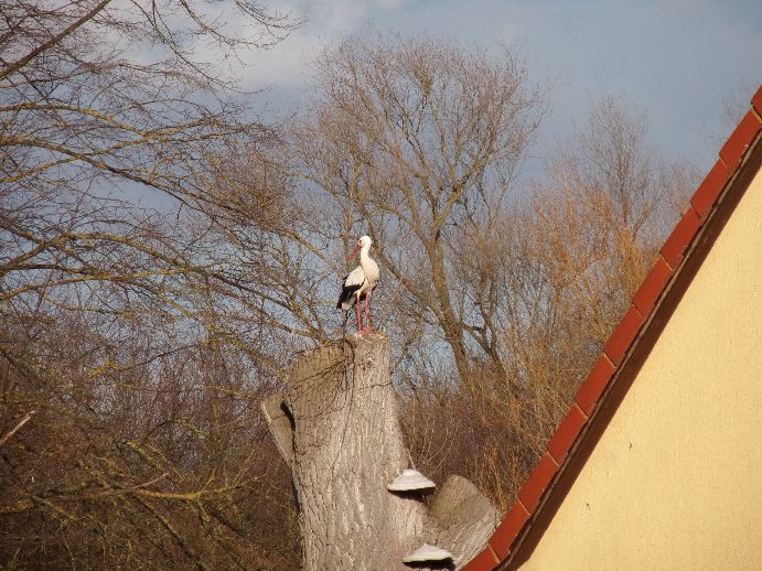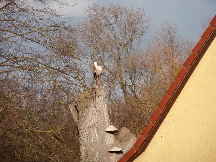 Ende Februar / Anfang März 2026: Auf einem der hohen Baumstümpfe am Verbindungspfad zwischen Heinrich-Jasper-Haus und dem Ende der Steinhorstwiese hinter dem Haus der Riekestr. 6 wurde wieder ein Storch gesichtet.